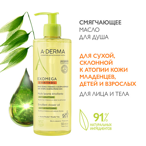 Смягчающее очищающее масло A-Derma Exomega l А-Дерма Экзомега дополняет линейку средств для ухода за очень сухой и атопичной кожей лица и тела. Оно надолго увлажняет, успокаивает, снимает зуд и подходит для любого возраста. Основу масла составляет экстракт ростов овса Реальба: он зарекомендовал себя как эффективное средство для снятия раздражения. Активные компоненты: комплекс Flaxerine (филлагрин, жирные к-ты Омега-6) помогает коже удерживать влагу, делает ее гладкой и мягкой, восстанавливает липидную пленку; экстракт ростков овса Реальба интенсивно увлажняет, смягчает, успокаивает эпидермис, способствует заживлению микроповреждений; лимонная к-та нейтрализует щелочи в воде, отшелушивает отмершие клетки, выравнивает тон кожи и восстанавливает ее сияние; глицерин защищает, смягчает, увлажняет кожу. Гипоаллергенно
