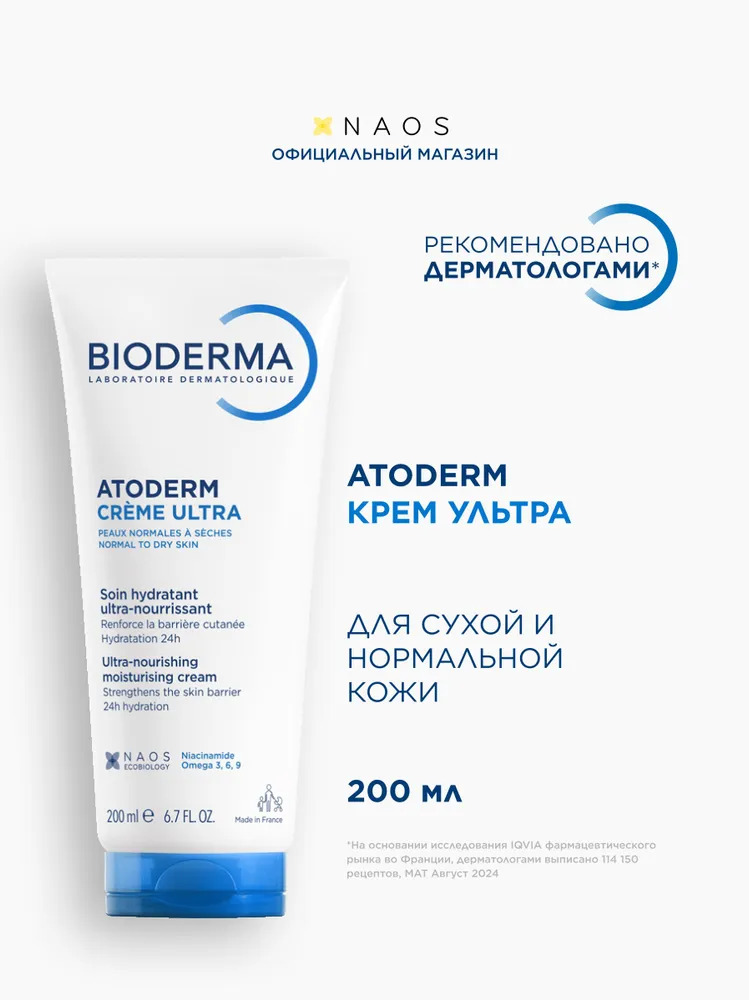Атодерм Крем Ультра (туба) 200 млКрем Bioderma Atoderm Ultra помогает восстановить защитный кожный барьер, который может страдать от многочисленных факторов, например, медикаментозного лечения, погодных условий, аллергических реакций и некоторых косметических ингредиентов. Эффект длится 24 часа. Подходит для взрослых, подростков, детей и младенцев.