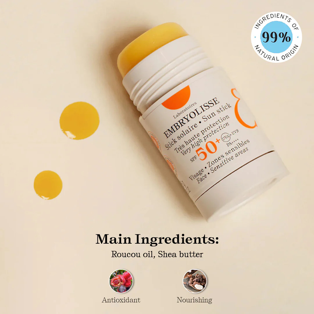 EMBRYOLISSE Sun Stick SPF50 компактное солнцезащитное средство в формате стика, обеспечивающее высокую степень защиты от ультрафиолетовых лучей (UVA и UVB). Удобный формат делает его идеальным для точечного нанесения на чувствительные зоны лица и тела, таких как нос, уши и область вокруг глаз. Стик создан для того, чтобы обеспечить кожу надежной защитой от солнца. Содержит увлажняющие компоненты, которые помогают поддерживать кожу мягкой и увлажненной, предотвращая сухость. Гипоаллергенная формула безопасна для всех типов кожи, включая чувствительную.